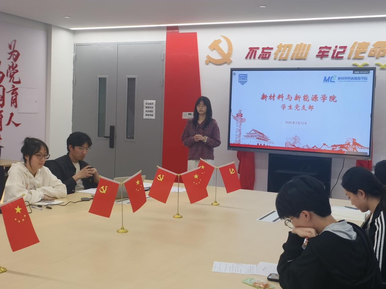 2026年3月12日,新材料与新能源学院学生党支部在B2-707召开党员大会,开展专题学习、部署学习教育、召开组织生活会及接收预备党员。会议由支部书记任新开主持,全体党员参加。