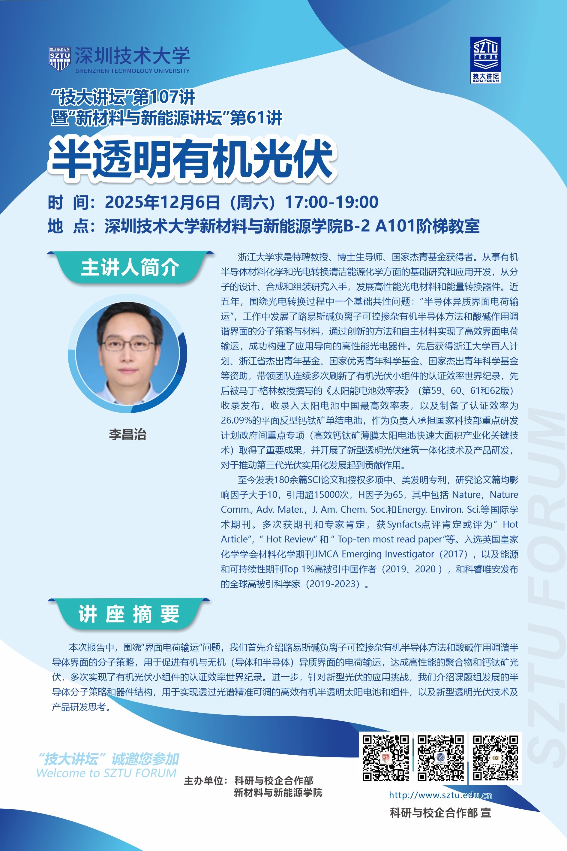 “技大讲坛”第107讲暨“新材料与新能源讲坛”第61讲:半透明有机光伏